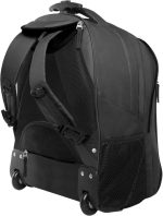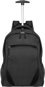 TPMOC513 Morral de viaje con llantas. Medidas 55 x 34,5 x 20 cm. Capacidad 37 litros. Polyester. Morral/Carrion. Mango extensible hasta 52 cm. Un bolsillo frontal con cierre y dos bolsillos laterales de red. Dos compartimentos: el principal con un bolsillo porta laptop; el segundo con dos porta bolígrafo, porta tarjeta y bolsillo pequeño. En la parte de atrás un bolsillo que permite guardar las correas y un bolsillo pequeño acolchonado en la parte inferior que contiene un cobertor para cubrir las ruedas. Los compartimentos principales llevan doble cierre con herrajes metálicos y tiras negras. La espalda es acolchonada y con red que permite la aireación de la espalda.